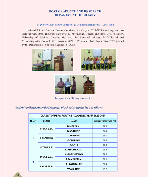 The Botany Department which has had a long and steady journey since its inception, has reached this height of accolade due to the sincere involvement and selfless dedication by the retired professors, like Prof. T. S. Partha, Dr. Padmini Devi Krishnan, Prof. M. P. Murugesan, Prof. B. Subramanian, Prof. O. S. Vivekanandan, Prof. S. Bharathan, Prof. A. V. Govindaraj, Prof. Nirmala Sambandam, Prof. D. Balasubramania Reddy, Prof. T. S. Shanmugam, Prof. B. Kasturi Bai. Prof. C. R. Bojan and Prof. G. Kathiresan.