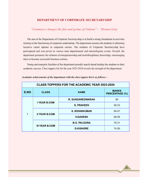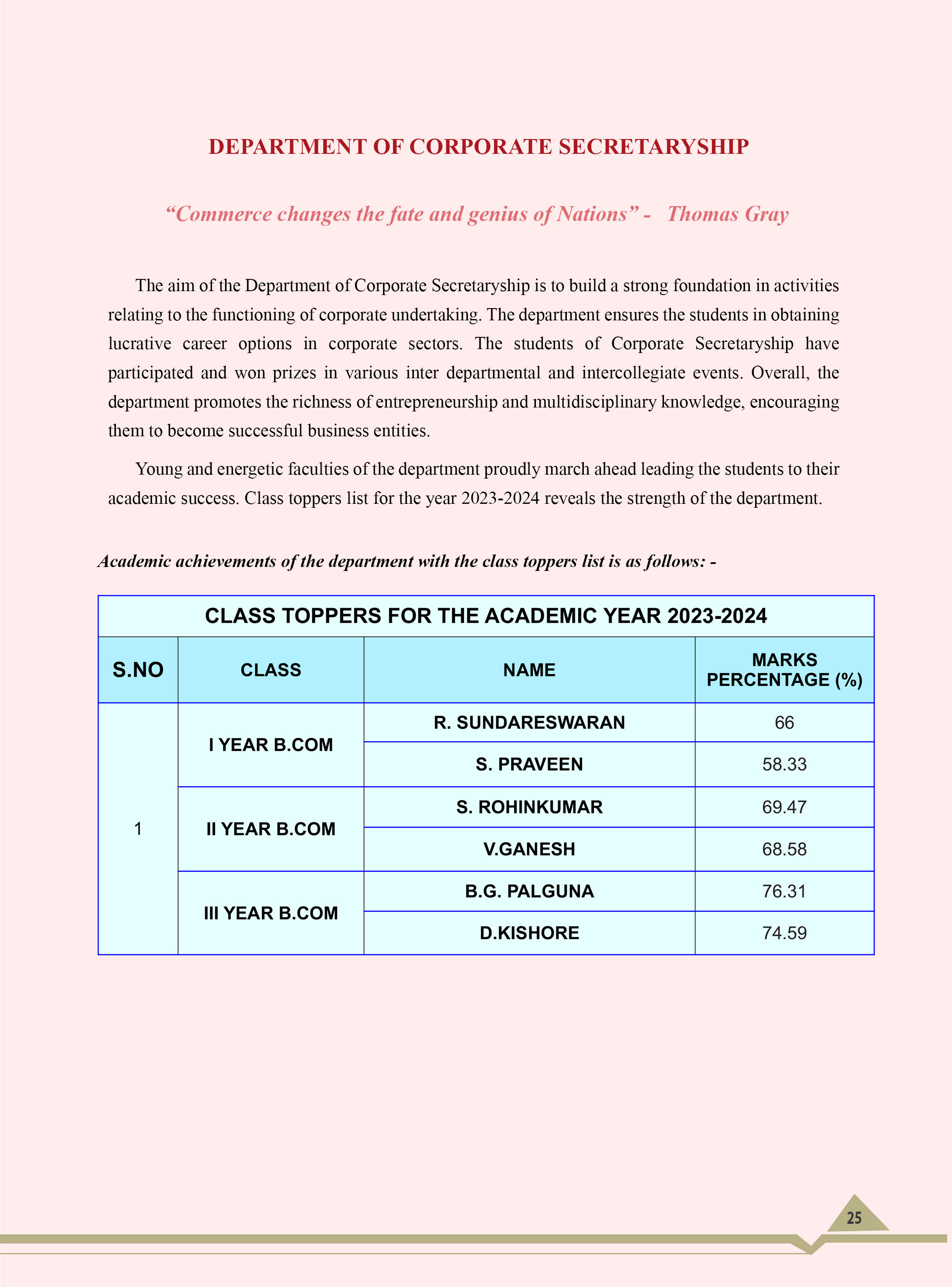The Department of Corporate Secretaryship started in the Year 1988. Since its inception, the purpose