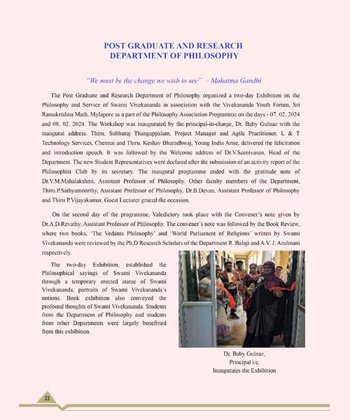 Regional seminar on Yoga, Philosophy and practice was organized by the department to commemorate the 175th Anniversary of Pachaiyappa's college. About 500 students participated in the seminar the programme coordinator Dr A.D Revathy Asst.Professor and other members Dr VM Makhalakshmi Asst Professor, Deputy Head of the department,Mr. P.Sathiyamoorthy Asst. Professor, Dr.B. Devan Asst. Professor, Dr. Jeris Emmanuel Asst.