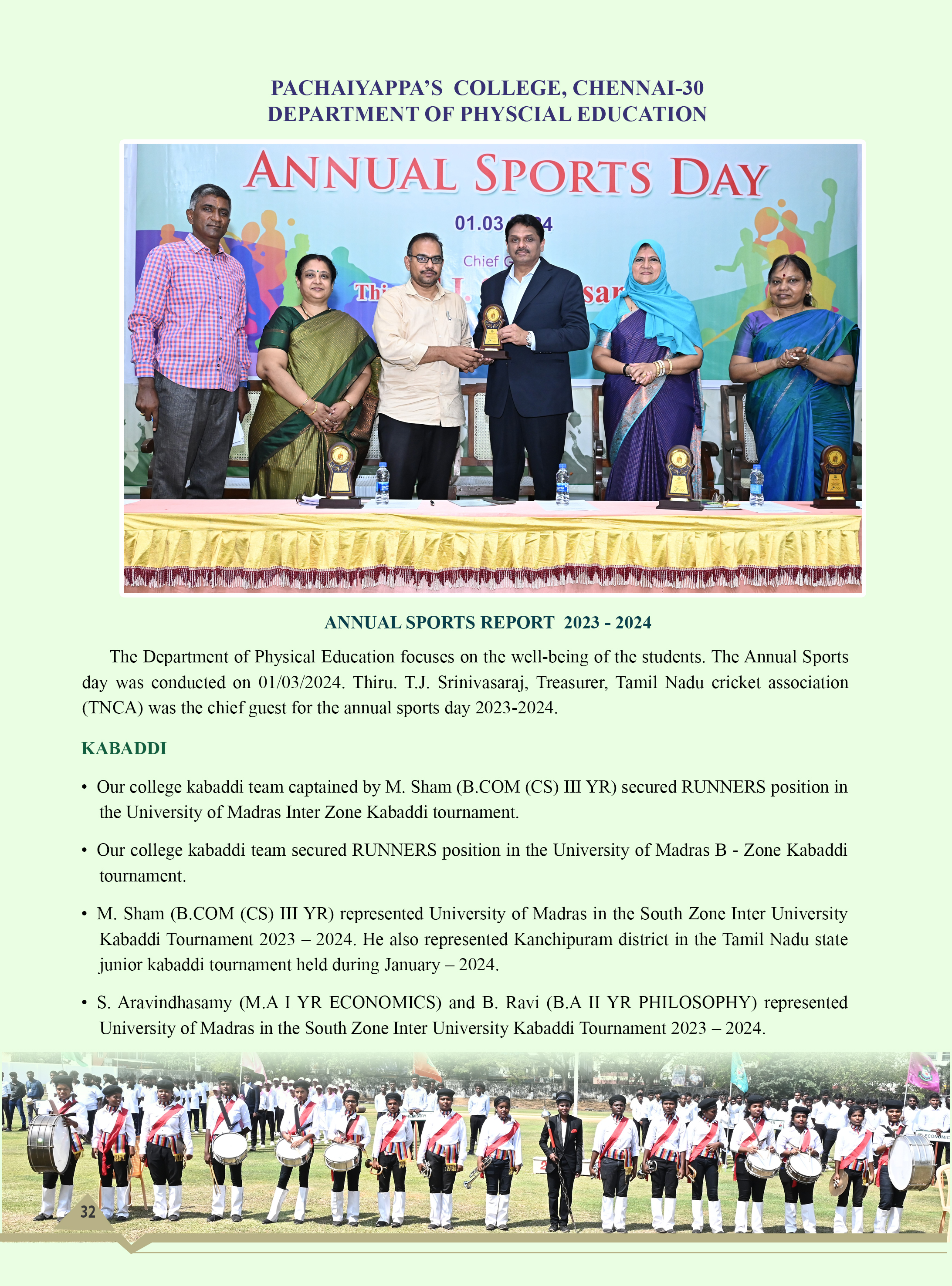The college Kabaddi team won the University of Madras Champions title for 4 years