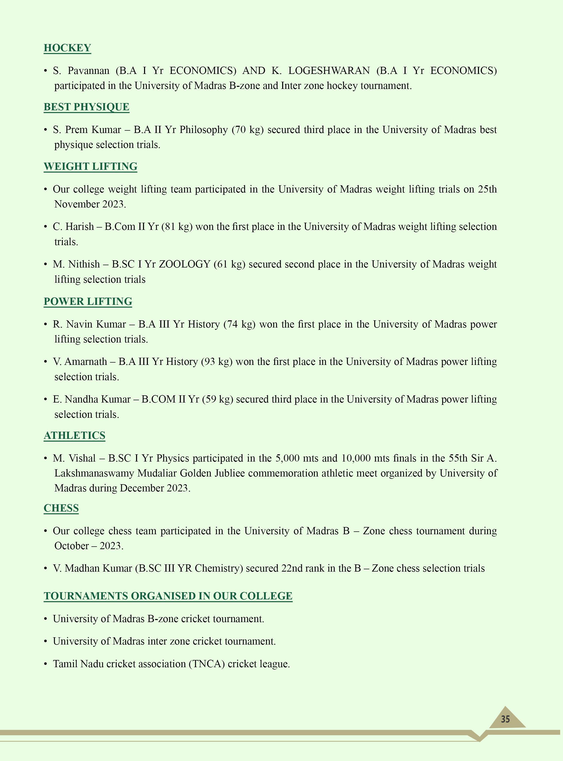 Hockey team won the University of Madras Champions title for 17 years.