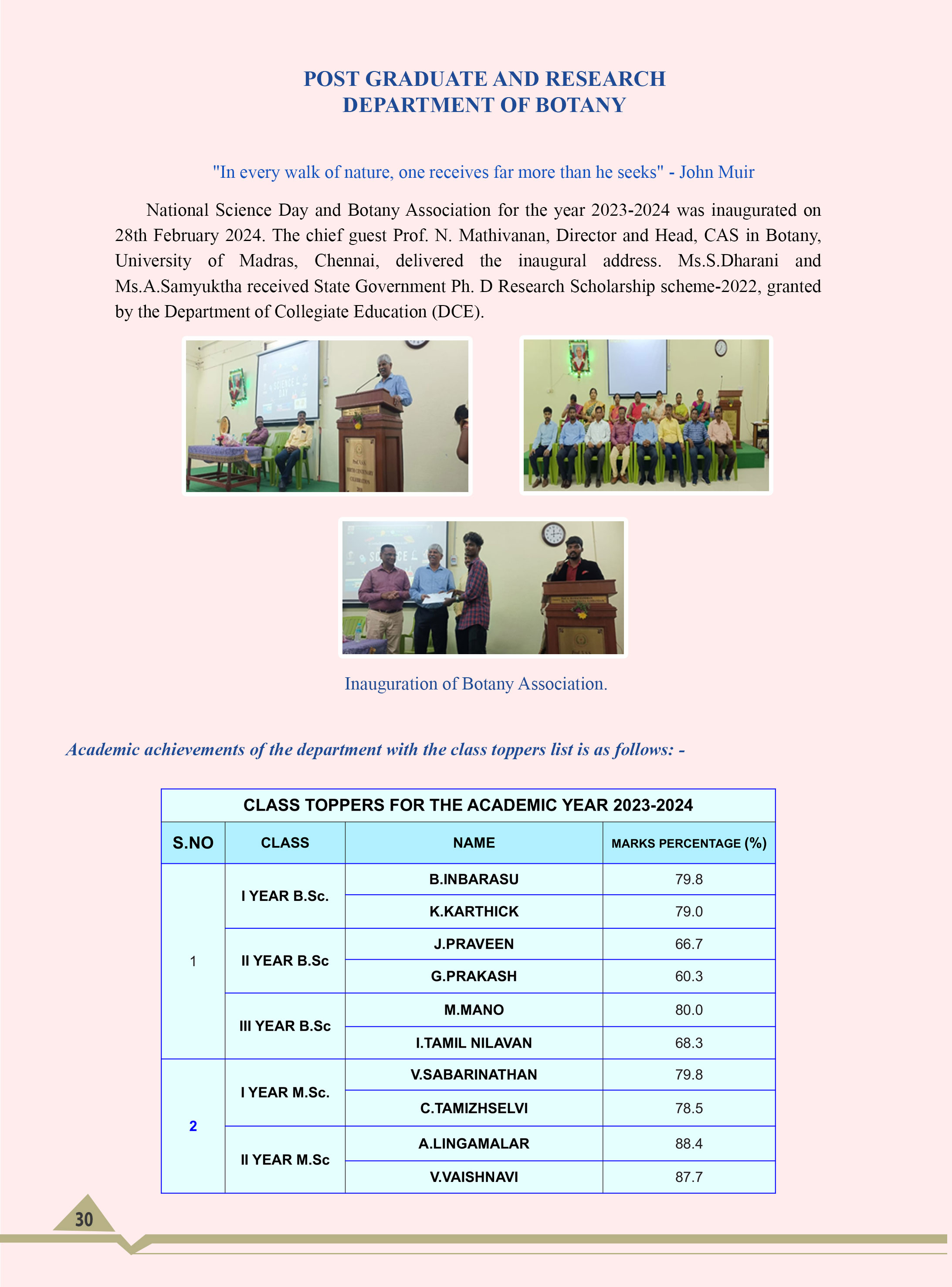The Botany Department which has had a long and steady journey since its inception, has reached this height of accolade due to the sincere involvement and selfless dedication by the retired professors, like Prof. T. S. Partha, Dr. Padmini Devi Krishnan, Prof. M. P. Murugesan, Prof. B. Subramanian, Prof. O. S. Vivekanandan, Prof. S. Bharathan, Prof. A. V. Govindaraj, Prof. Nirmala Sambandam, Prof. D. Balasubramania Reddy, Prof. T. S. Shanmugam, Prof. B. Kasturi Bai. Prof. C. R. Bojan and Prof. G. Kathiresan.