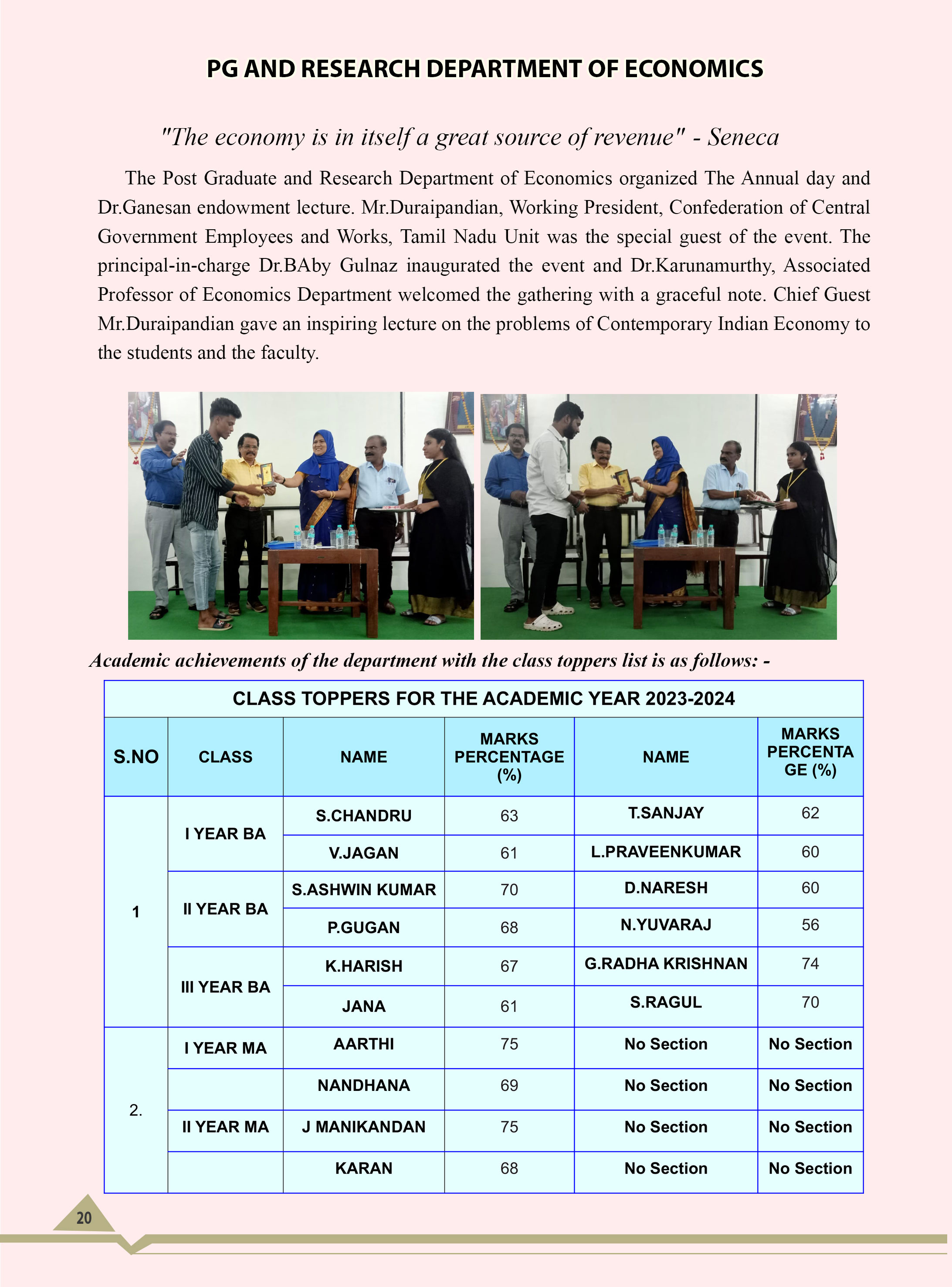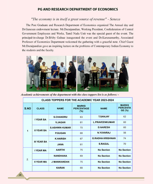 The Post-Graduate and Research Department of Economics has distinguished itself to
