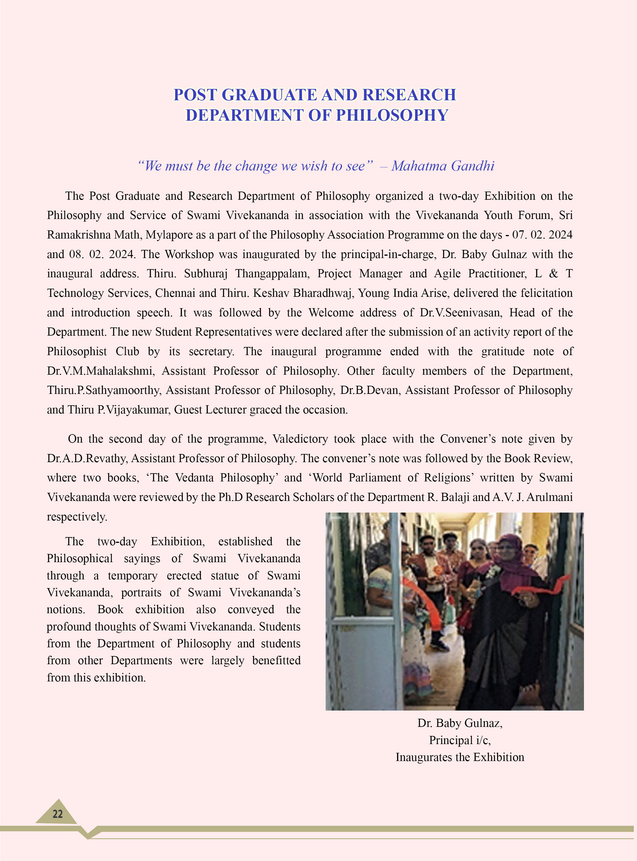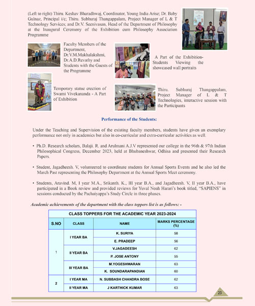 Regional seminar on Yoga, Philosophy and practice was organized by the department to commemorate the 175th Anniversary of Pachaiyappa's college. About 500 students participated in the seminar the programme coordinator Dr A.D Revathy Asst.Professor and other members Dr VM Makhalakshmi Asst Professor, Deputy Head of the department,Mr. P.Sathiyamoorthy Asst. Professor, Dr.B. Devan Asst. Professor, Dr. Jeris Emmanuel Asst.