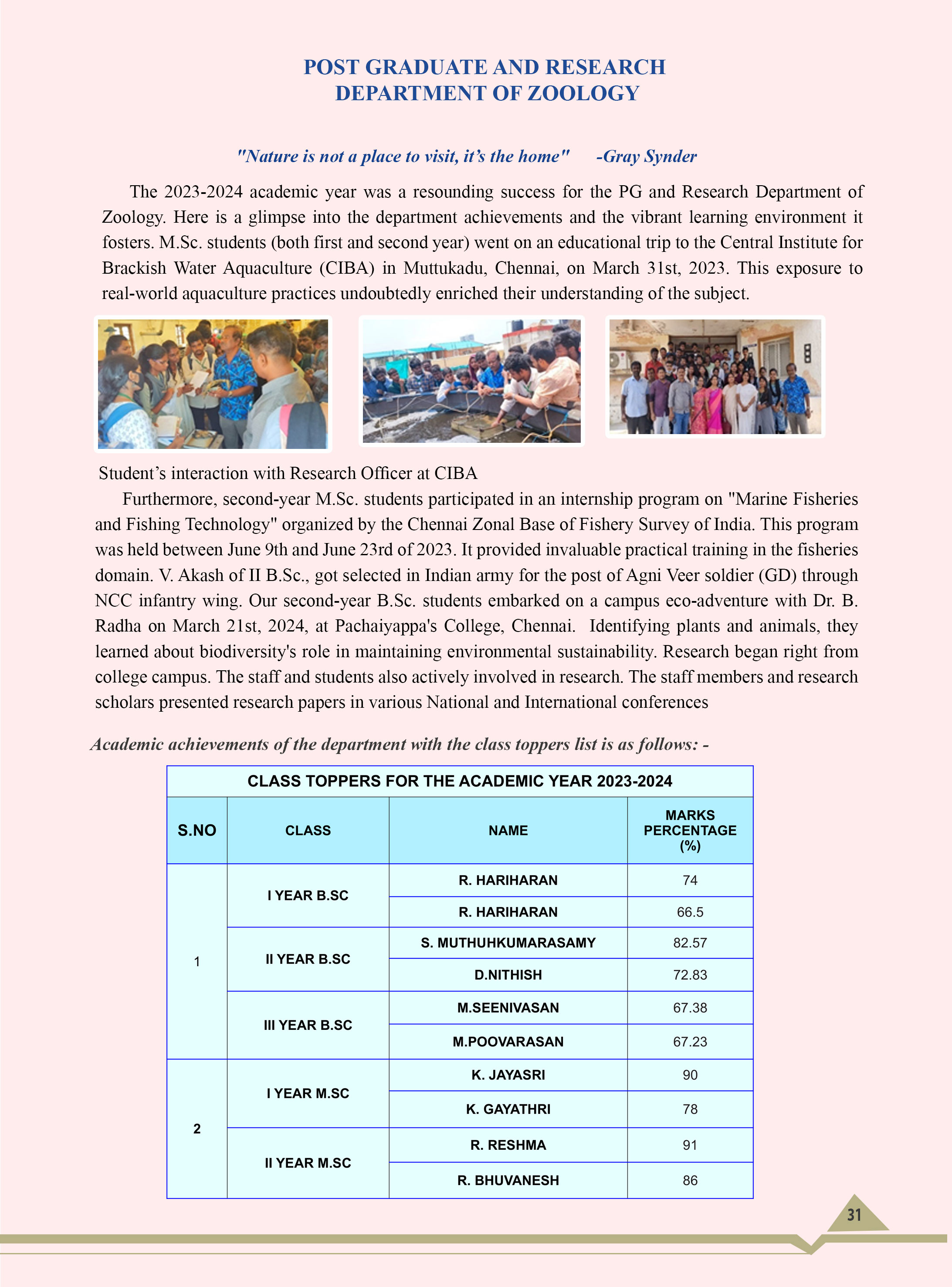 next year ie.. in 1958, M.Sc. degree course in Zoology, was the first science department of our