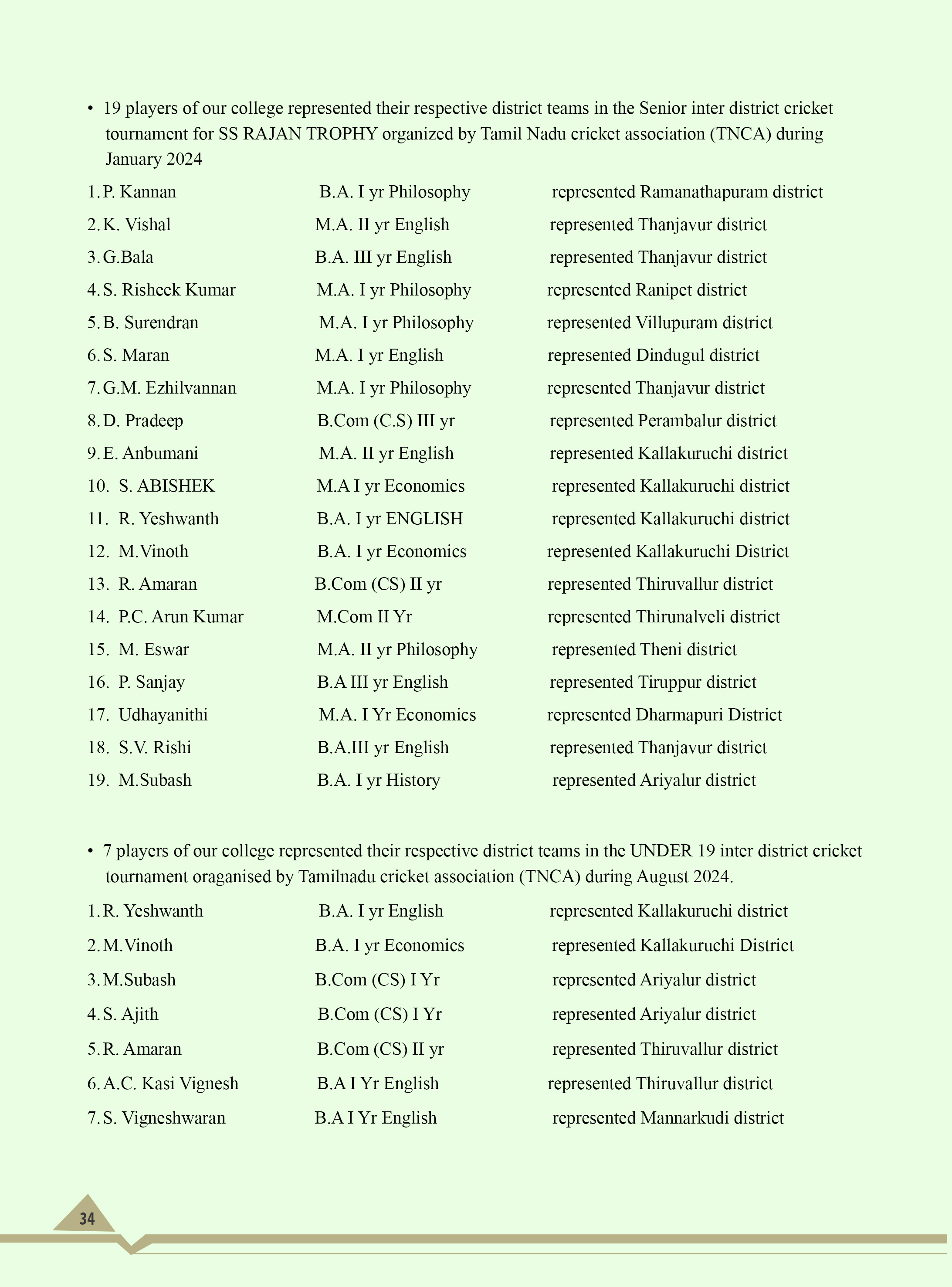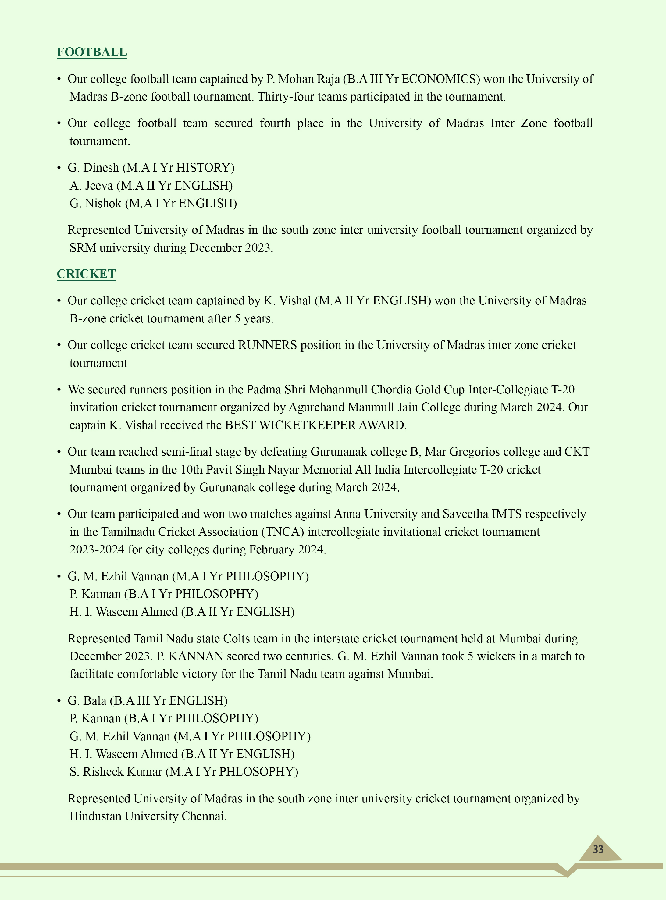 The college Cricket team won the University of Madras Champions title for 2 years (1999-2000