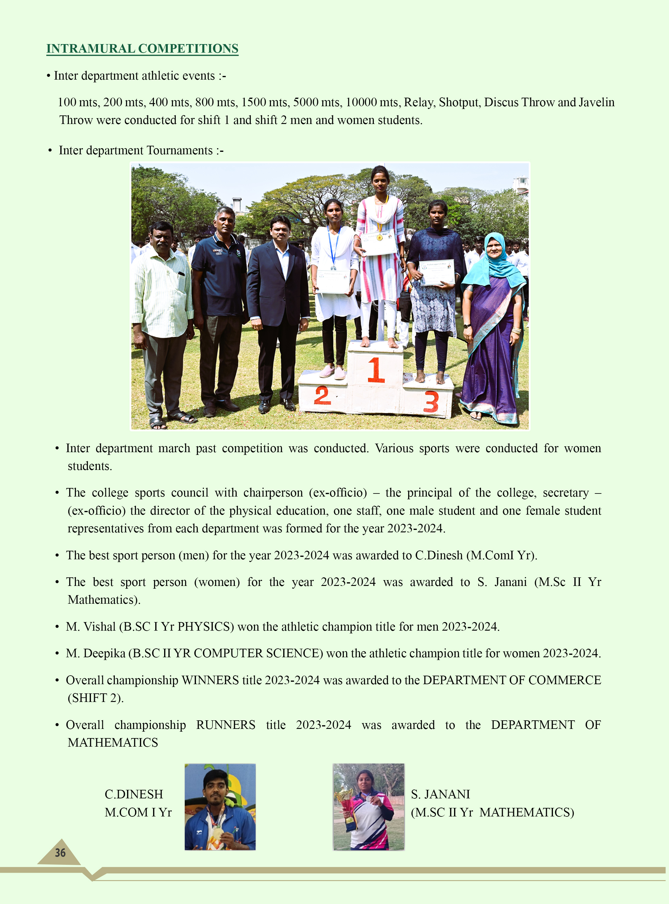 The college Volleyball team won the University of Madras Champions title for 1 year